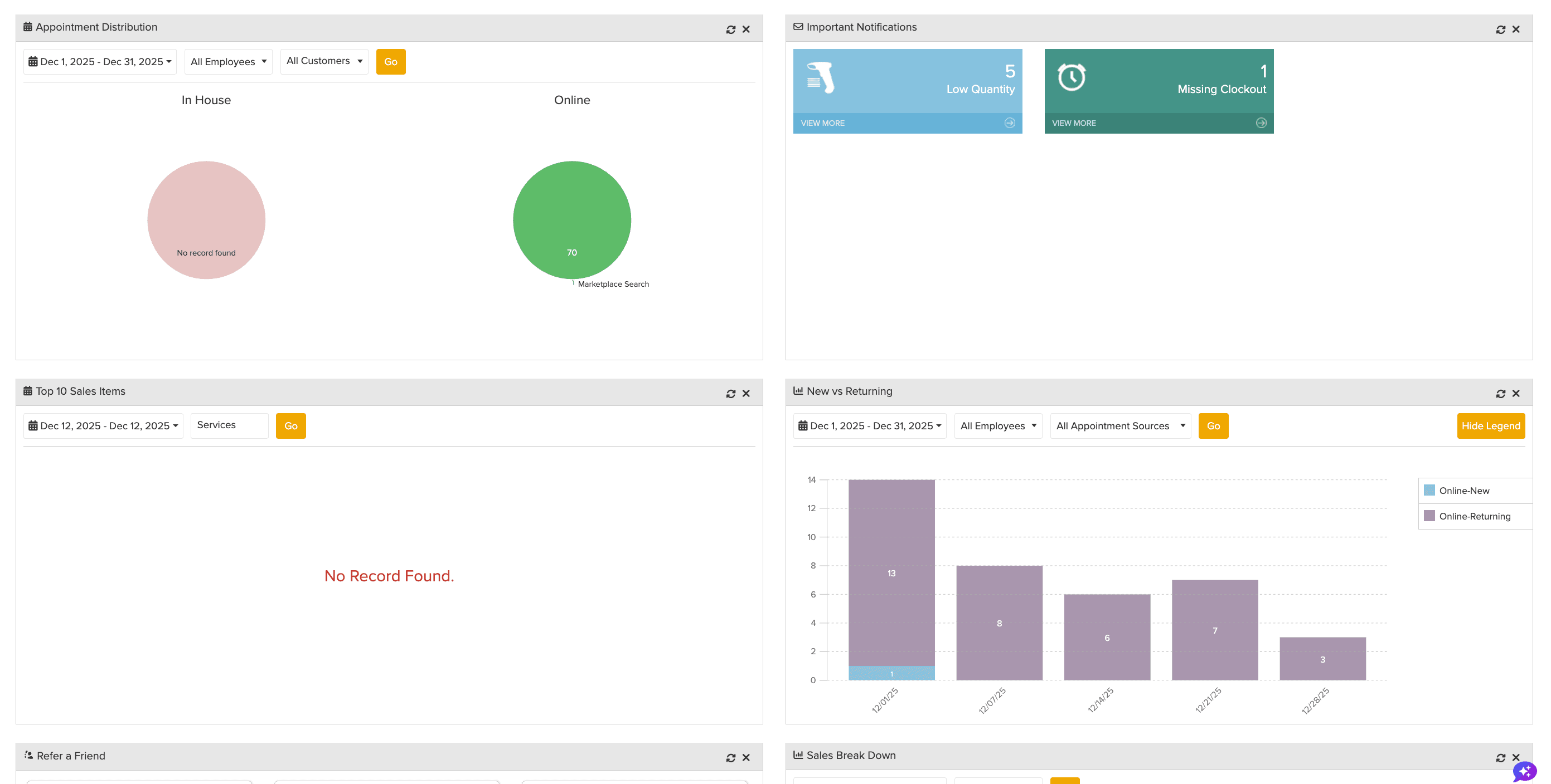 Vagaro’s reporting suite has grown into one of the most robust on the market. From payroll and sales to client retention and utilization, Vagaro gives business owners an at-a-glance view of what’s actually happening behind the scenes. The depth can feel overwhelming at first, but once you get familiar with the dashboard, you’ll appreciate how many insights are available without needing a separate analytics tool.